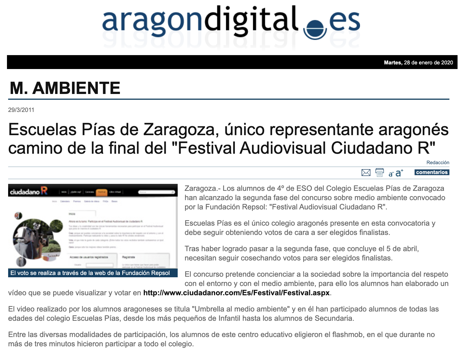 Escuelas Pías de Zaragoza, único representante aragonés camino de la final del «Festival Audiovisual Ciudadano R».